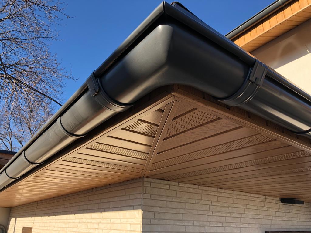 Подбирали комплект водосточной системы, заказали три внешних угла желоба. Устанавливал сам, монтировать очень легко, крепятся плотно.