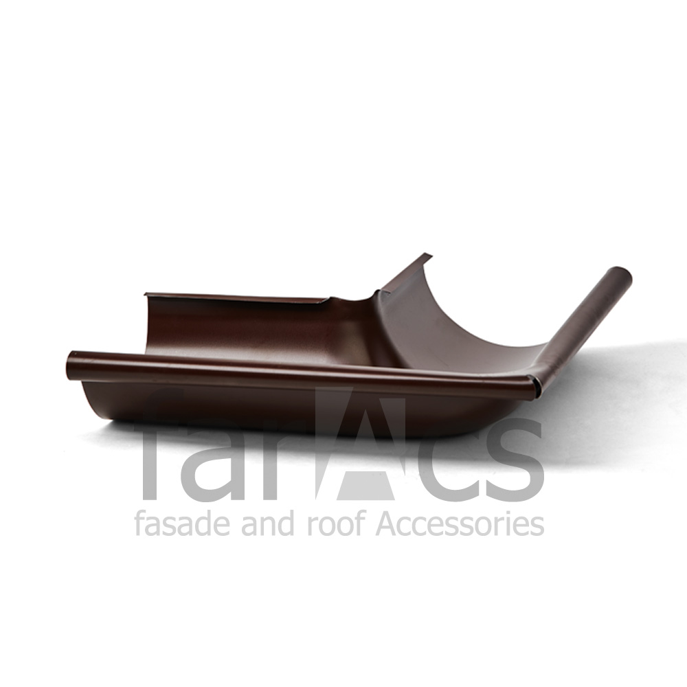 Обеспечивает гладкий и эффективный переход воды от одной части водосточной системы к другой. Он имеет точную форму, соответствующую углу поворота, и обеспечивает герметичное соединение между секциями желоба.